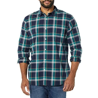 Amazon Essentials Men's Long Sleeved Slim Fit Stretch Poplin Shirt, Dark Green Navy Medium Plaid, S
