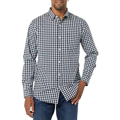 Amazon Essentials Men's Long Sleeved Slim Fit Stretch Poplin Shirt, Dark Navy Gingham, S