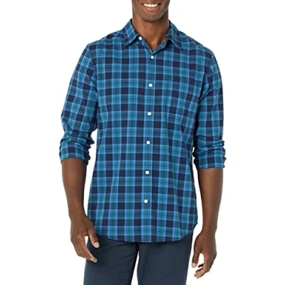 Amazon Essentials Men's Long Sleeved Slim Fit Stretch Poplin Shirt, Green Navy Plaid, XL