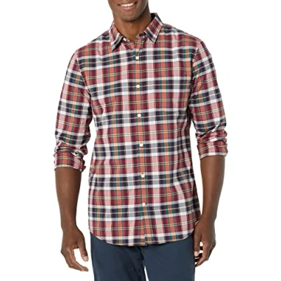Amazon Essentials Men's Long Sleeved Slim Fit Stretch Poplin Shirt, Navy Red White Plaid, S