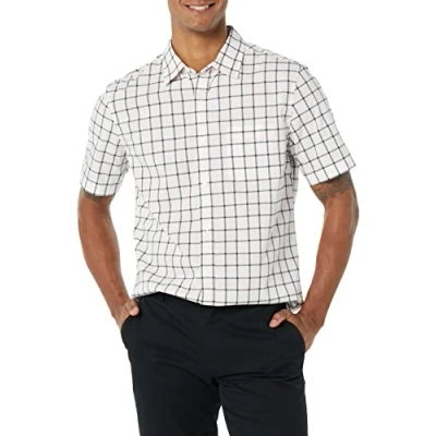 Amazon Essentials Men's Short Sleeve Stretch Poplin Shirt (Available in Big & Tall), Pink White Buffalo Plaid, S