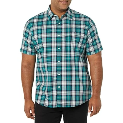 Amazon Essentials Men's Short Sleeve Stretch Poplin Shirt (Available in Big & Tall), Teal Blue White Plaid, S