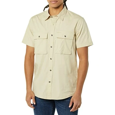 STANDARD FIT: Easy through chest and tapered through waist. STRETCH POPLIN: Lightweight yet durable washed poplin with 2% stretch for comfort and mobility, a fabric for all seasons. EVERYDAY SHIRTING: With classic shirting details, this short sleeve poplin shirt is the perfect year-round wardrobe staple. Designed to be tucked in for a more polished look or untucked for a laid back yet sophisticated look. Versatile enough to be worn with jeans, chinos, or shorts. DETAILS: Spread collar construction, center front placket with metal button closure, two chest pockets with button flap closure, and shirttail hem.