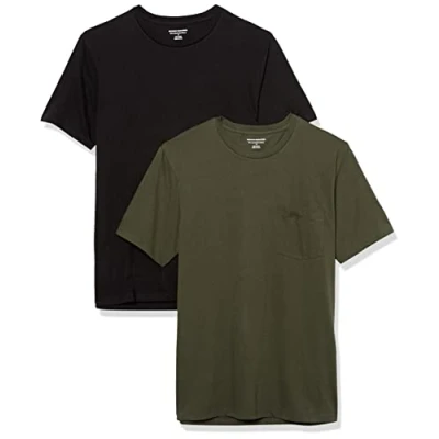 Amazon Essentials Men's T Shirt Slim Fit Short Sleeved Crewneck Pocket, Pack of 2, Black/Olive, M