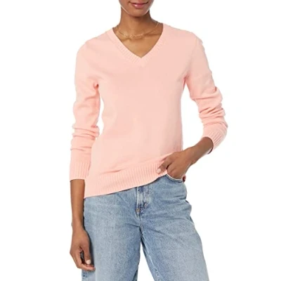 Amazon Essentials Women's 100% Cotton Long Sleeve V Neck Jumper, Peach, S