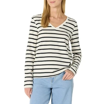 Amazon Essentials Women's 100% Cotton Regular Fit Long Sleeve V Neck T Shirt, Eggshell White Black Mariner Stripes, S