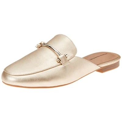 COMFORT AND FIT: These loafer mules have a padded insole with high-quality memory foam for added comfort. Available in regular and wide-widths. The open back ensures a comfortable fit. MATERIAL: Amazon Essentials shoes are made from high-quality alternative leather materials. This style has a faux calfskin upper and is lined in faux leather. STYLE: These slipper mules have a stylish round toe, metallic bit hardware, and a modern upper design. DETAILS: 3/8 inch heel with a flexible non-slip sole. DESIGN: These mule slides take you from day to night and can be paired with your favorite Amazon Essentials outfit.