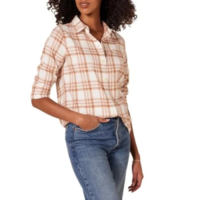 Amazon Essentials Women's Classic Fit Long Sleeve Lightweight Plaid Flannel Shirt, Ecru Pale Pink Alpine Plaid, S