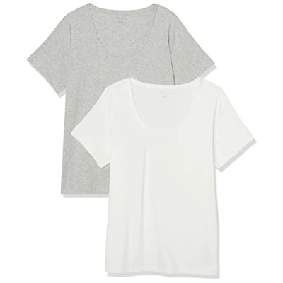 Amazon Essentials Women's Classic Fit Short Sleeve Scoop Neck T Shirt (Available in Plus Size), Pack of 2, White/Light Grey Heather, S