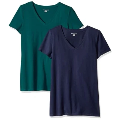Amazon Essentials Women's Classic Fit Short Sleeve V Neck T Shirt, Pack of 2, Dark Green/Navy, S