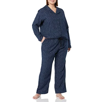 Amazon Essentials Women's Flannel Long Sleeved Button Front Shirt and Trousers Pyjama Set, Navy Dots Print, S