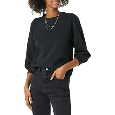 RELAXED FIT: Relaxed, comfortable fit through the body. COZY BRUSHED BACK FLEECE: Buttery soft and comfy midweight cotton blend fleece with brushed interior. BLOUSON SLEEVE SWEATSHIRT: Feminine sweatshirt with soft volume blouson sleeve. Perfect for work, travel, weekend wear, or lounging at home. DETAILS: Features a classic crewneck, feminine, gathered 3/4 length sleeves, and ribbing at neck, cuffs, and hem for enhanced stretch and recovery.