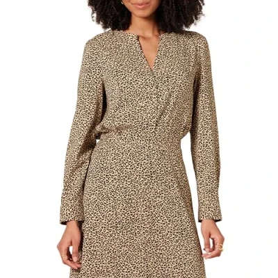 Amazon Essentials Women's Georgette Long Sleeved Relaxed fit Popover Blouse, Taupe Leopard, S