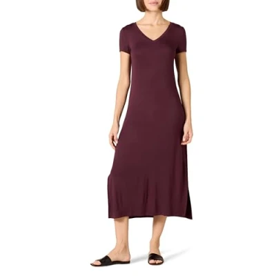 Amazon Essentials Women's Jersey V Neck Short Sleeved Midi Length Dress, Dark Purple, S