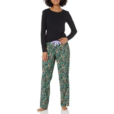 Amazon Essentials Women's Lightweight Flannel Trouser and Long Sleeve T Shirt Sleep Set (Available in Plus Size), Black Folkloric, XXS