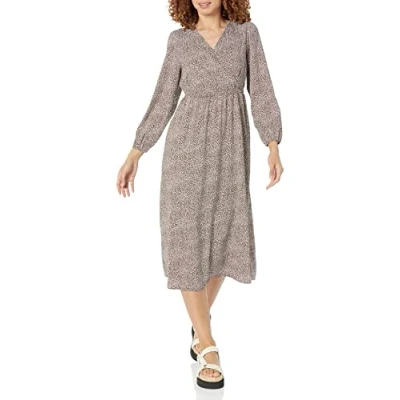 Amazon Essentials Women's Lightweight Georgette Long Sleeved V Neck Midi Dress (Available in Plus Size), Espresso Leopard, S