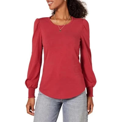Amazon Essentials Women's Long Sleeve Crewneck Smocked Cuff T Shirt, Dark Red, XL