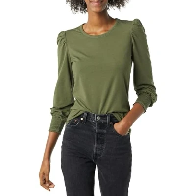 Amazon Essentials Women's Long Sleeve Crewneck Smocked Cuff T Shirt, Olive, XXL