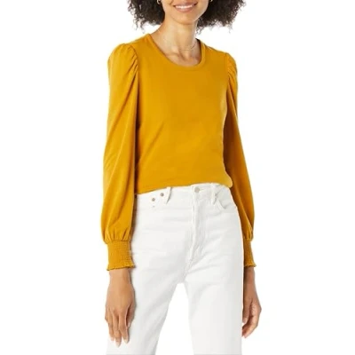 Amazon Essentials Women's Long Sleeve Crewneck Smocked Cuff T Shirt, Tobacco Brown, S