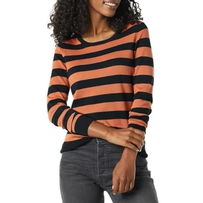 Amazon Essentials Women's Long Sleeve Lightweight Crewneck Jumper (Available in Plus Size), Black Caramel Rugby Stripe, S