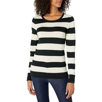 Amazon Essentials Women's Long Sleeve Lightweight Crewneck Jumper (Available in Plus Size), Black Oatmeal Heather Rugby Stripe, S