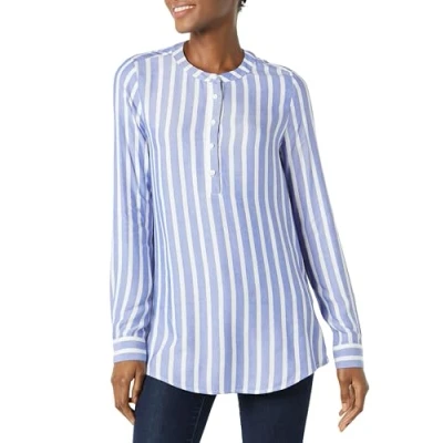 RELAXED FIT: Relaxed, comfortable fit through the body DRAPEY FLUID TWILL: Made of 100% viscose, our non stretch viscose is extremely breathable and lightweight. With a beautiful drape and a soft, smooth finish, this fabric is comfortable and easy to wear all year round EASY POPOVER BLOUSE: This versatile blouse is a classic wardrobe essential, perfect for at work, on the go, or weekend exploring Details: Features a simple band collar, easy button front popover closure, long sleeves, curved shirttail hem with side slits, and back yoke with shirring for a relaxed roomy feel ADDITIONAL FABRIC & CARE INFORMATION: Due to the delicate nature of viscose fabric, we recommend that you wash it at cold temperature and hang dry to prevent fabric shrinkage and wrinkles caused by any extra heat. Gently iron or steam for an even crisper, polished look. Kindly check and measure with size chart before selecting size Note : Please check and measure with the Size Chart before selecting your size