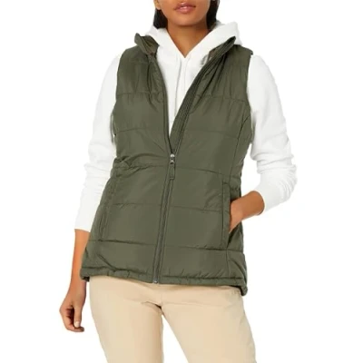 REGULAR FIT: Close but comfortable fit through chest, waist, and hips. WATER-RESISTANT POLYESTER TAFFETA: 100% Polyester plain weave shell fabric. Fully lined, quilted and insulated. Designed to keep you extra protected for the coldest winter days. COLD-WEATHER STYLING: This midweight puffer vest is the perfect essential bringing comfort and warmth to your everyday. Wear it with a long sleeve t-shirt for brisk fall days or layer with a sweater during colder winter months. Accessorize your look with Amazon Essential's Scarves and Beanies. DETAILS: Features a classic quilted pattern, flattering seam details for the perfect fit, front zipper closure, zip pockets, and stand collar.