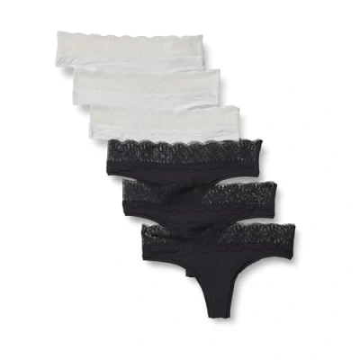 Amazon Essentials Women's Peached Microfibre with Lace Trim Thong, Pack of 6, Black/White, 20