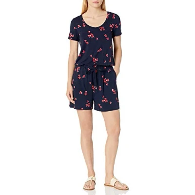 Amazon Essentials Women's Short Sleeve Scoop Neck Playsuit, Navy Red Tulips, S