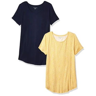 Amazon Essentials Women's Short Sleeve Scoopneck Tunic, Pack of 2, Navy/Yellow Tulips, XL