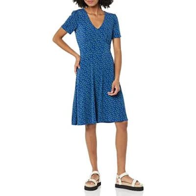 Amazon Essentials Women's Short Sleeve V Neck Gathered Fit and Flare Dress, Bright Blue Floral, XS