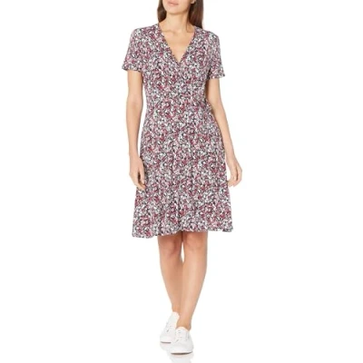 Amazon Essentials Women's Short Sleeved Faux Wrap Dress, Navy Ditsy Floral, S