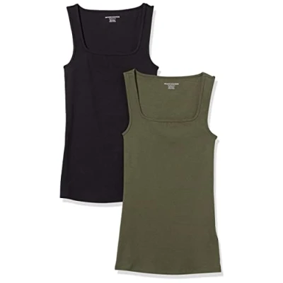 Amazon Essentials Women's Slim Fit Square Neck Tank, Pack of 2, Black/Dark Olive, XS
