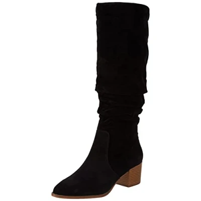 COMFORT AND FIT: These block-heel tall boots have a padded insole with high-quality memory foam for added comfort and an inside half zipper for easy entry. MATERIAL: Amazon Essentials shoes are made from high-quality alternative leather materials. This style has a faux kidsuede upper and a comfortable textile lining. Available in regular and wide-width calf sizes. STYLE: These boots have a stylish gathered shaft and stacked faux leather heels. DETAILS: 2 inch heel with a flexible non-slip sole. Shaft height measures 15 inches from where your heel sits to the top of the shaft. DESIGN: These versatile boots take you anywhere and can be paired with your favorite Amazon Essentials outfit.
