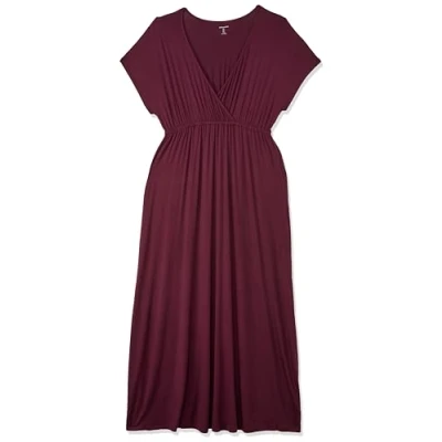 FIT & FLARE: Fitted through chest and waist, flared to hem. RAYON STRETCH JERSEY: This soft and drapey lightweight jersey has a smooth, polished finish. Also offered in a sustainably sourced option 95% Rayon (Lenzing Ecovero Viscose), 5% Elastane. WAISTED MAXI DRESS: This versatile and figure-flattering flowy maxi dress seamlessly transitions from day to night. Pair with your favorite sneakers for a day exploring the city or dress up for an evening out with Amazon Essentials Women's Espadrilles, DETAILS: Features an elastic empire waist for all-day comfort while providing a flattering fit. V-neck overlap neckline, dolman short sleeves, and maxi length. LENGTH: 35" from side neck on US size S.
