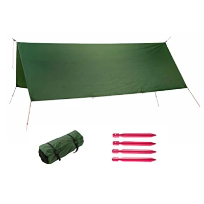 Extra large XXL 12 m² tarp from Amazon Ultra lightweight with a weight of only 1.06 kg Extremely waterproof and tear-resistant 100% ripstop polyester (210T), PUR-coated Super versatile as a rain roof, awning, wind protection, weather protection Many features such as 4 additional eyelets for securing on the side edges, storage pockets for the ropes, adjustable carabiner and 4 Y-pegs