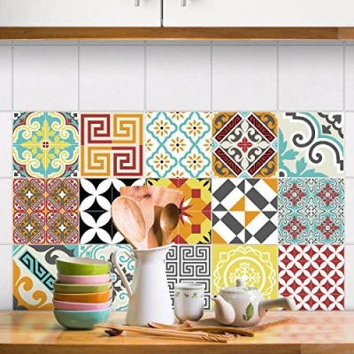 15 Tiles Stickers 15 x 15 Cement Tile effect. HIGH QUALITY: New printing technology, modern and unique design, last trend to embellish your house. Decorate your kitchen, bathroom or toilet with the Ambiance Sticker Tile Decal mosaic effect. EASY APPLICATION: It allows an accurate installation of your azulejos mosaic tile without formation of air bubbles. The self-adhesive decals are pre-cut. Therefore, the application is simple, you just have to remove it from the paper support and put it on a smooth and clean area. ORIGINAL DECORATION: Create originality with the tiles wall stickers and its beautiful color palettes, its original engravings and its colorful drawings. You can place the 15 pieces the way you want. This gives you multiple options to decorate your place. DURABLE AND RESISTANT: Lifetime of 5 years. High quality of the print, non-flammable, no smell, resistant to high temperatures (-40 to 85 ° C) to scratches and to water. No use of aggressive or abrasive products, clean with fresh water.