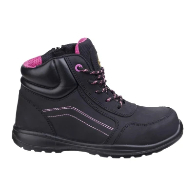 Composite lightweight lace up ladies safety boot with quick-access side zip, breathable mesh lining, padded PU comfort collar and dual density PU outsole -Action Smooth Leather Upper -Breathable Mesh Lining -200 Joules Fibre Glass Composite Toecap -Anti-penetration Non-Metal Midsole -Side Zip for Quick Access -Padded PU Collar and PU Tongue -Removable EVA Footbed -Dual Density Injected PU Outsole