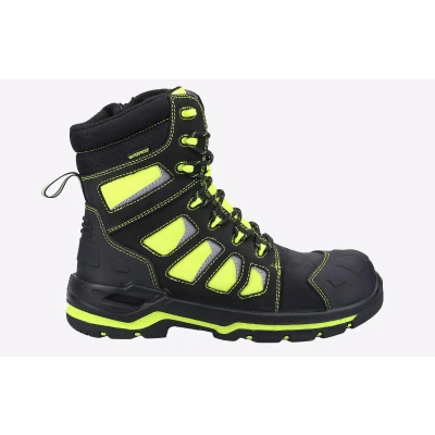 Hi-Leg Metal Free Hi-Vis Safety Boot with YKK side zip has been developed to tackle all types of industries in most adverse conditions. Hi-Vis fluorescent waterproof Cordura ensures maximum visibility at any time of day. - Metal Free Boot with Yellow Safety Hi Viz Waterproof CORDURA- Water Resistant Full Grain Nubuck Leather Upper- Internal Waterproof Membrane- Moulded TPU Toe Guard for Extra Durability- Moulded TPU Heel Counter for Enhanced Heel Support and Protection- Reflective Piping and Loop for Maximum Visibilty- Deep Padded Mesh Collar for Extra Comfort- YKK Side Zip for Easy Access- Comfortable, Cushioned and Removable PU Footbed- Injected PU Midsole Enhances Comfort and Shock Absorption