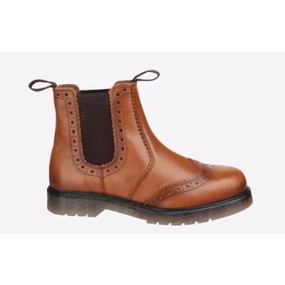 Amblers Safety present the Dalby, a hardwearing semi-formal pull on brogue dealer boot, perfect for casual wear any time of day. A matte leather upper gives it a stylish look with a wing-tip trim, whilst a textile lining and cushioned PVC sole adds comfort.- Brogue dealer boot crafted with a tan full grain leather upper - Front and rear industrial strength textile pull loops - Slip on twin gusset style with dual elasticated sides - Upper fashioned in brogue styling and wing-tip toe finish - Contoured heel with shaped heel stiffener - Smooth PU lining for durable finish - Hardwearing cushioned PVC sole unit