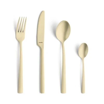 Introduce timeless elegance and unparalleled functionality to your dining table with the Manille Stonewash 16-piece Cutlery Set - Champagne from Amefa . Carefully crafted with an eye for detail and quality, this cutlery set is designed to elevate any meal, from everyday dinners to special occasions. This edition of the Manille has been finished with great precision. And is characterized by its rough finish and minimalist design. Unique features and specifications: * High Quality Stainless Steel: Known for its durability and beautiful finish that will not fade even after years of use. * Design: Elegant lines and a balanced weight provide a comfortable dining experience, while the rugged stonewash finish gives it a beautiful look and makes it very unique. * Versatile Use: Suitable for both formal dinners and casual meals, this cutlery set adds a touch of class to any meal. * Dishwasher safe: No hand washing required, these knives can simply be placed in the dishwasher. * 16 parts, suitable for 4 people: The set consists of 16 parts including: 4 tablespoons 4 table spoons 4 table forks 4 coffee spoons A wonderful gift Each set comes in a beautifully designed box, ideal as a gift for weddings, housewarmings, or as a luxurious addition to your own dining table. 2 year warranty Full of confidence in the quality of the Amefa cutlery sets, we offer a 2-year warranty on material and manufacturing defects. Order today With the Manille Stonewash 16-piece Cutlery Set - Champagne from Amefa you not only bring functionality to your table, but also an heirloom that will be cherished for generations. Order now and experience perfection in every bite.