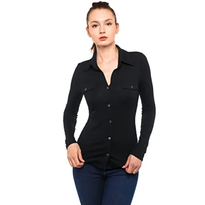 Polo & V-Neck Hybrid Design: Innovatively combines polo collar styling with V-neck tailoring, accented with a refined chest pocket and adjustable button placket, blending professional polish with casual sophistication. Slim Office Fit: Tailored slim cut follows body contours with clean shoulder lines and a neat hem, ideal for pairing with trousers or skirts to create a polished professional look. Knit Stretch Comfort Fabric: Made from 94% Rayon and 6% Spandex knit blend, offering soft skin-friendly texture with gentle stretch for freedom of movement and all-day comfort. Business & Casual Versatility: Suitable for layering under blazers in formal settings or wearing alone with jeans for casual occasions, meeting both professional and lifestyle wardrobe needs. Sizing & Care Note: Sizing: This is a slim-fit style and runs small. Recommend ordering one size up. Refer to the size chart before purchase.Model in pictures is 5 feet 10 inches (178cm) tall wearing size S. Care: :Machine wash cold. Wash dark colors separately. Hang to dry.