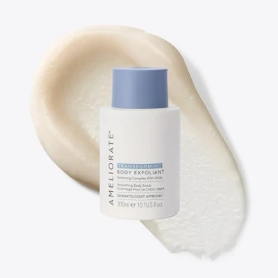 AMELIORATE Transforming Body Exfoliant 300ml for Keratosis Pilaris (KP), Bumpy & Dry Skin Dual Action AHA Bamboo Scrub Hydrating Smoothing Dermatologist Approved