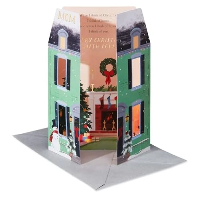 Front Message: Mom Inside Message: When I think of Christmas, I think of home… and when I think of home, I think of you. Merry Christmas with love This American Greetings Christmas card for mom features a unique fold and gold foils Card measures 5 in. x 7 in. Envelope included American Greetings offers exceptional greeting cards, gift wrap and celebration products so you can connect in ways that fit your personality and authentic style