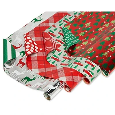 American Greetings Christmas Reversible Wrapping Paper Bundle, Stripes, Polka Dots, Plaid, Reindeer, Trucks and Trees (4 Rolls, 120 sq. ft)