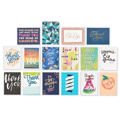 This deluxe thank-you greeting card bundle features trend-forward designs and heartfelt sentiments for showing appreciation for gifts received, kind gestures and just because. Quality-made greeting cards feature thick paper stocks, exceptional artistry and gold foil accents on select designs. Elegant scrollwork, contemporary artwork, on-trend prints, whimsical hand lettering, cute and fun messages and puns, and cheerful color palettes combine in this collection of sweet and thoughtful thank-you notes. A huge variety of looks and messages are perfect for a variety of people like a friend, co-worker, mom, dad, neighbor, caregiver, petsitter, brother, sister, grandma, grandpa, aunt, uncle, mail carrier and multiple sending situations, including client tha Includes 32 thank-you cards (16 designs, 2 cards of each design). All cards include envelopes.