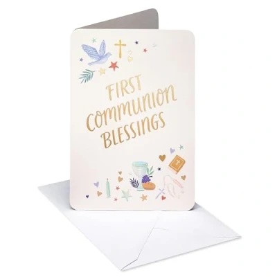 Front Message: First Communion Blessings Inside Message: The blessing of the Lord be upon you… Psalm 129:8 This communion card by American Greetings features religious icons and gold foils. This card measures 6.75 in. x 4.625 in. White envelope is included. American Greetings offers exceptional greeting cards, gift wrap and celebration products so you can connect in ways that fit your personality and authentic style.