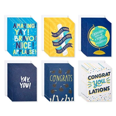 Includes 48 cards (6 unique designs, 8 cards of each design) and 48 white envelopes Each card is blank on the inside allowing you to write a personalized message. This set of blank greeting cards features bright and celebratory artwork on each cover to inspire you to write a personal congratulations on the blank space inside each card. Cards feature graduation imagery like diplomas and mortarboards, as well as general congratulations in bright and trendy hand lettering. Greeting card packs from American Greetings are perfect for celebrating graduations and saying congrats to anyone, including a friend, kid, co-worker, classmate, student, neighbor, retiree, new homeowner, boyfriend, girlfriend, husband, wife, mom, dad, da