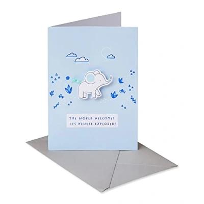 Front Message: The world welcomes its newest explorer! "Inside Message: Wishing you and your new baby boy lots of happy discoveries! Congratulations American Greetings baby card features a cute design with a baby elephant, blue foil embellishments and raised detailing with a sweet congratulatory message Card measures 4.625 in. x 6.75 in. Envelope included. Extra postage may be required. American Greetings offers exceptional greeting cards, gift wrap and celebration products so you can connect in ways that fit your personality and authentic style