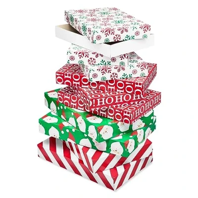10 gift boxes with lids Robe boxes measure 17 in. x 11 in. each. Shirt boxes measure 14 in. x 9 in. each The robe boxes feature two unique designs—The first is red and white diagonal stripes, the other a pattern of cheerful Santa heads on a green background. The shirt boxes also feature two unique designs—The first is a red and white “Ho Ho Ho” repeated lettering pattern, the other a delightful pattern of decorative red and green snowflakes on white. Perfect for holidays, birthdays, celebrations, or other occasions! American Greetings offers exceptional greeting cards, gift wrap and celebration products so you can connect in ways that fit your personality and authentic style